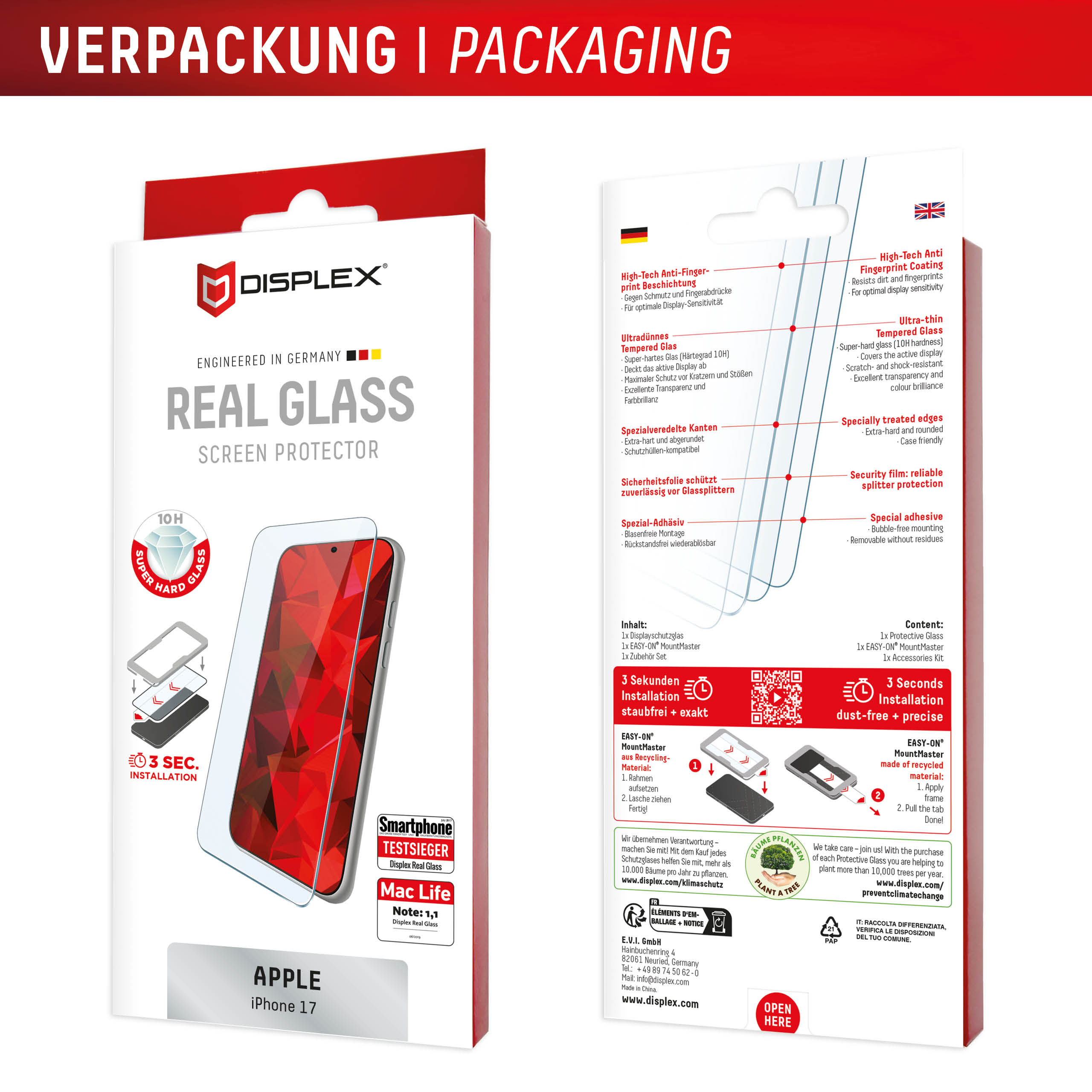 Climate protection is a special concern for us. That is why we are working to reduce emissions as much as possible and to design packaging that is as environmentally friendly as possible. The sustainable EASY-ON® Eco Mounting Frame made of premium solid cardboard, which replaces the plastic mounting frame that has proven itself millions of times over, makes a special contribution to this. In addition, we are also actively committed to the reforestation of our forests: DISPLEX® launched a sustainability initiative in August 2019 and plants over 10,000 trees every year together with "Plant-for-the-Planet". As a result, DISPLEX® is well on its way to becoming a climate-neutral brand.